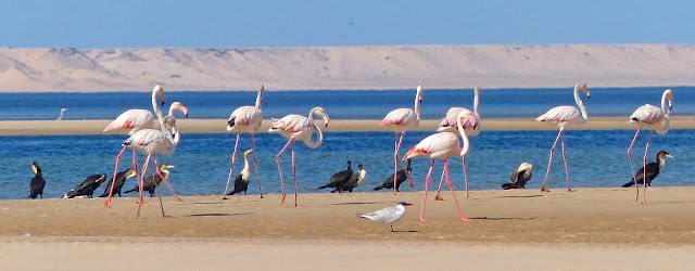 Promenade joyeuse au milieu des bancs de sable où courent les oiseaux. Les cormorans effilés ouvrent prestement leurs ailes pour les sécher. Aigrettes et petites mouettes se démènent et semblent jouer. Les placides flamands roses regardent cela de très haut d’un air dédaigneux. L’eau est claire et les trous dans le sable en allant vers la Dune Blanche montre que les couteaux sont nombreux. Pour le pêcheur, appât pour le leurre ou bien à garder pour les griller, il faudra choisir.