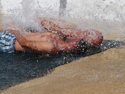 Pantois, les amis sont restés stoïques attendant de voir. La douche s’est faite au tuyau de pompe à incendie. Couché sur le dos puis sur le ventre la puissance du jet est telle qu’elle pourrait vous arracher les bijoux de famille si vous ne les protégiez pas. La puissance naturelle du jet peut vous coucher à tout moment. Mais il fait du bien à l’impact sur les muscles, il est puissant et vous respirez le soufre qui vous dégage les narines.